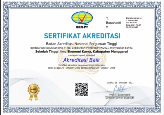Rilis tersebut berdasarkan pada diterbitkannya SK pemenuhan syarat peringkat akreditasi Nomor: 935/SK/BAN-PT/Akred/PT/X/2021 yang ditandatangani oleh Prof. T. Basaruddin selaku Direktur Dewan Eksekutif BAN PT. Sebelumnya pada Tanggal 13-14 Oktober 2021, STIE karya Ruteng telah melaksanakan visitasi oleh Assesor BAN PT Prof. Dr. Made Sudarma (Universitas Brawijaya Malang), dan Prof. Dr. Bernand Isyandi (Universitas Riau).