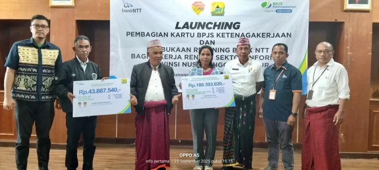 Penyerahan secara simbolis dilaksanakan di Aula Ranaka Kantor Bupati Manggarai, bersamaan dengan Launching Pembagian Kartu BPJS Ketenagakerjaan dan Pembukaan Rekening Bank NTT bagi Pekerja Rentan Sektor Informal Provinsi NTT.